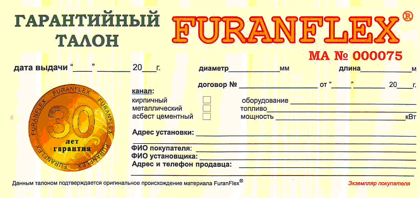 Официальный гарантированный венгерским производителем срок службы полимерного вкладыша FuranFlex (ФуранФлекс) — 30 лет! Фактически же, время эксплуатации трубы FuranFlex(ФуранФлекс) не ограничено, скорее Вы будете реставрировать сам дом, чем Вам придётся производить ремонт дымохода. При каждой установке материала, выдаётся индивидуальный гарантийный талон сроком эксплуатации 30 лет. Гарантия Фуранфлекс подтверждает качество нашей технологии.