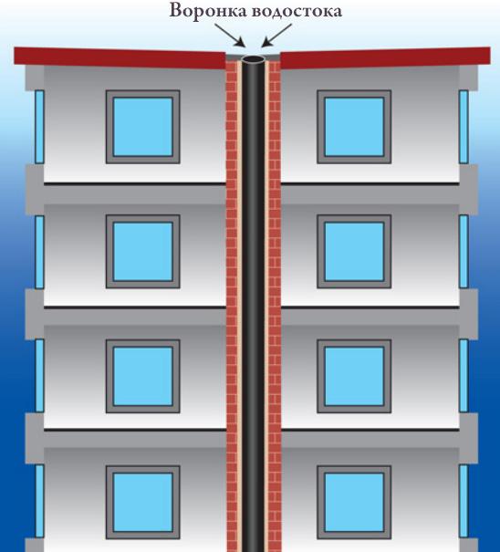У зданий с плоской крышей в некоторых местах крыши имеются вертикальные водосточные трубы. Они, как правило, изготовлены из железа, бетона или жесткого пластика. Коррозия и движение здания могут привести к повреждению этих трубопроводов. Их ремонт сложный и дорогой, часто связан с разрушением стен.