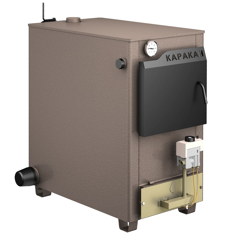 Котлы отопительные твердотопливные с водяным контуром КАРАКАН предназначены для обогрева жилых и производственных помещений площадью до 300 м². Встраиваются в любую систему отопления с давлением до 3 атм, с любыми расширительными баками.Присоединительные патрубки расположены слева и справа. Теплоноситель – вода либо антифриз для систем отопления.