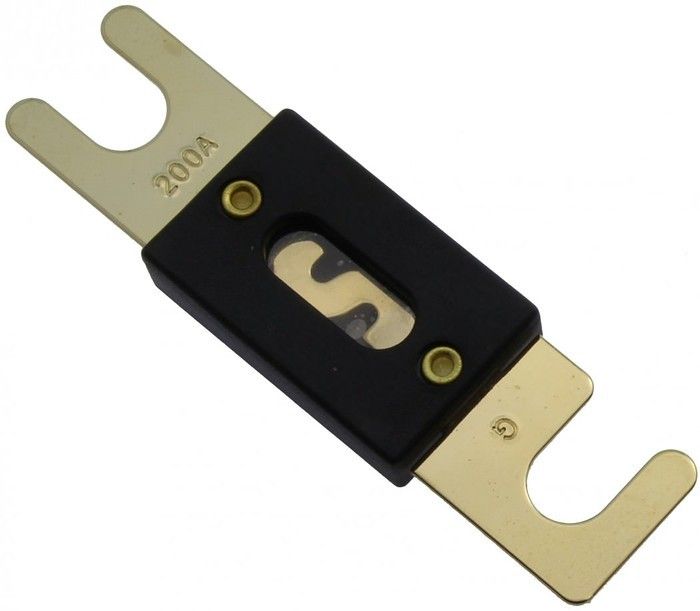 Предохранители ANL 200A представляют собой цельную металлическую пластину, которая плотно крепится в держателе болтами, поэтому это самый надежный вид предохранителя с наименьшим переходным сопротивлением.