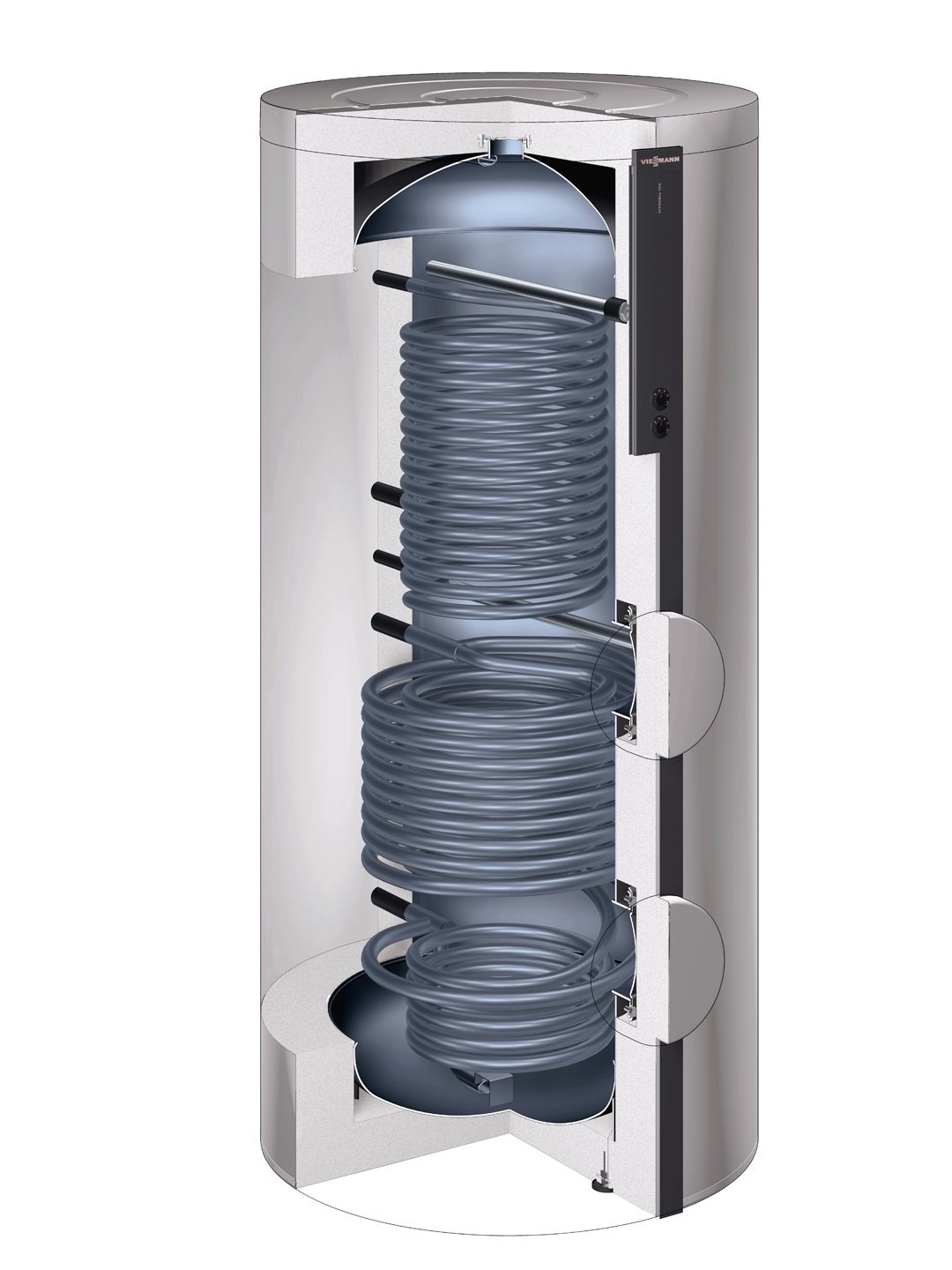 Техническое решение для экономичного приготовления горячей воды в сочетании с гелиоколлекторами и водогрейным котлом. Vitocell 100-B поставляется объемом 300, 400 и 500 л.