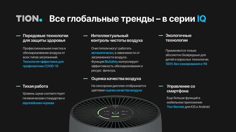 Очистители серии Tion IQ обеспечивают фильтрацию воздуха внутри помещения.